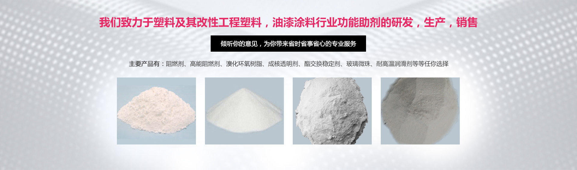 公司全心致力于以下幾個(gè)領(lǐng)域:阻燃劑在工程改性塑料的運(yùn)用,鹵素及其無鹵
